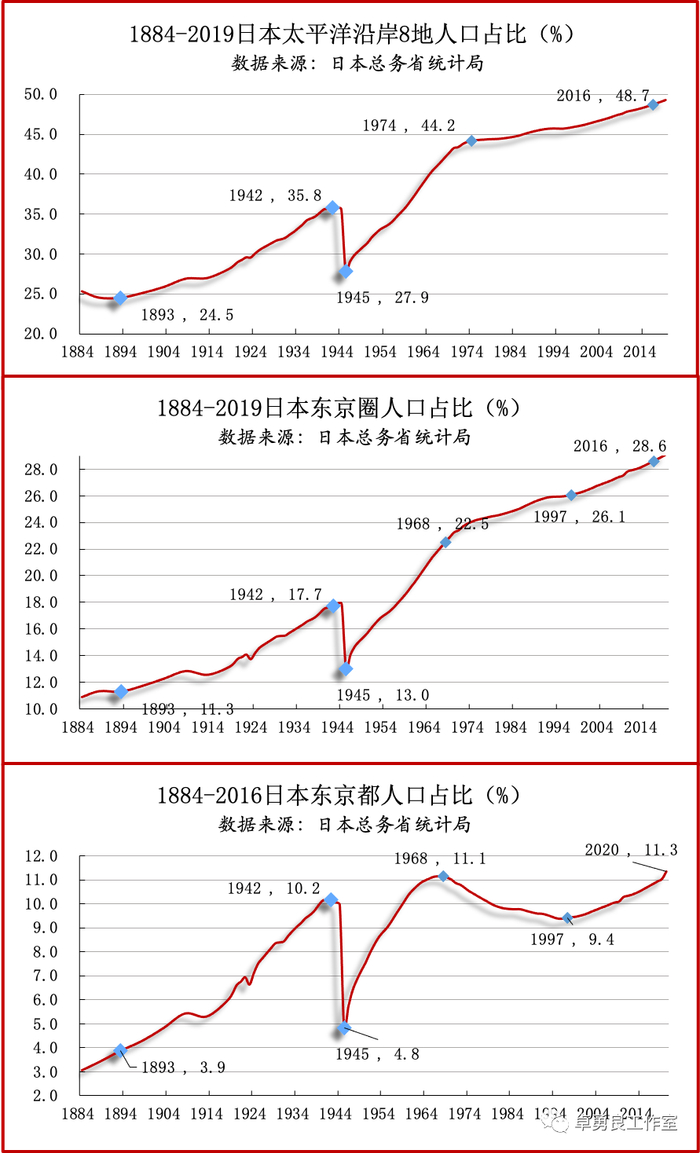 东京至大阪,直线约400余公里的太平洋沿岸8个地区的人口,1884年占日本的25.3%,2019年占49.3%。