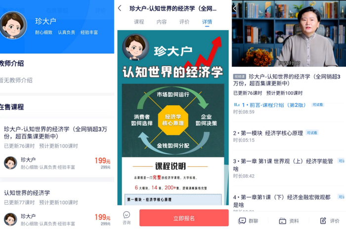 仍以“珍大户”为例:除了在抖音账号更新短视频,“珍大户”还在学浪平台推出了经济学系统课程《认知世界的经济》,以此实现从碎片化知识到系统课程的升级。她的课程设置了六大模块,14章节和200多集视频内容。课程中,“珍大户”把枯燥冗长的经济学理论结合到实用且丰富的案例中进行讲解,让理论变得通俗易懂,且具有实用性。