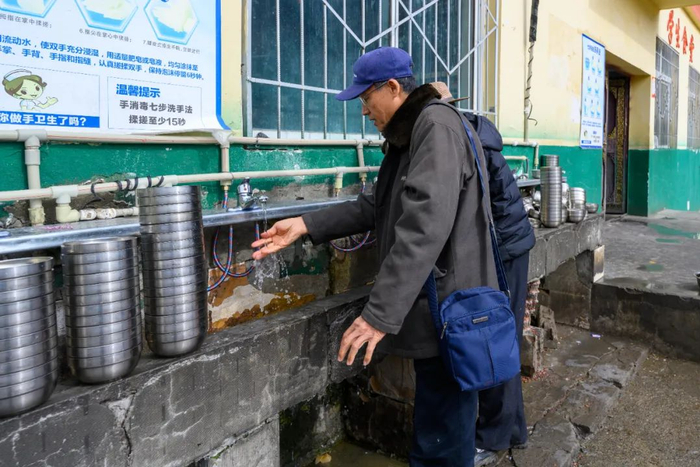 5月4日,在西藏昌都市类乌齐县类乌齐镇第二小学,李纯民在学生食堂的洗碗池前测试水温。本报记者刘金海摄