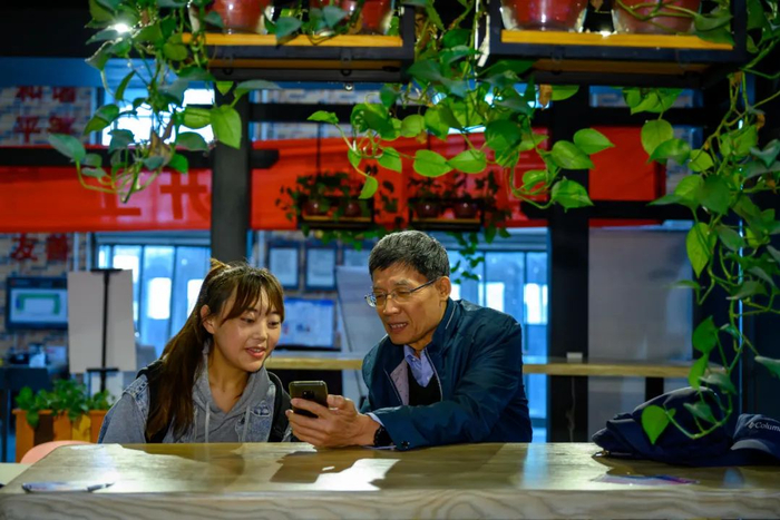 4月22日,在天津大学一处学生食堂,李纯民(右)与“齐兴”助学奖励基金资助的藏族学生扎西措姆交流。本报记者刘金海摄