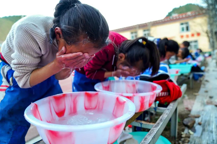 4月30日,在西藏昌都市类乌齐县桑多镇第二小学,学生们用热水洗漱。这套热水设施由李纯民发起的“齐兴”助学奖励基金捐助。本报记者黄臻摄