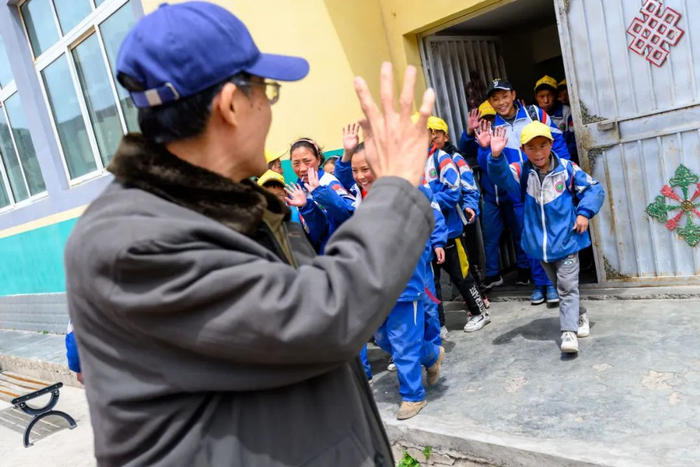 5月4日,在西藏昌都市类乌齐县长毛岭乡第一小学,学生们向李纯民道别。本报记者刘金海摄