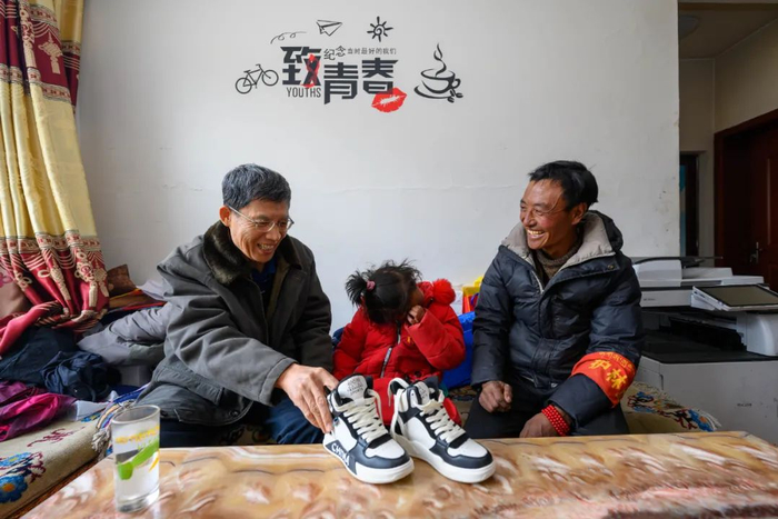 5月3日,扎西措姆(中)在父亲帕巴泽仁(右)的带领下,来到西藏昌都市类乌齐县伊日乡小学,从李纯民(左)手中获赠了一双为她专门定制的新鞋。扎西措姆自幼患有足部残疾,穿着普通的鞋子无法舒适地行走。本报记者刘金海摄