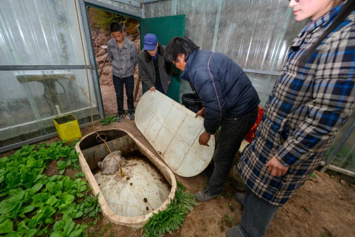 5月2日,李纯民赶到西藏昌都市类乌齐县滨达乡滨达村,为当地村民向巴巴登协调太阳能热水器的安装调试工作。这是李纯民(左二)在向巴巴登(右二)家中查看沼气罐的使用情况。本报记者刘金海摄