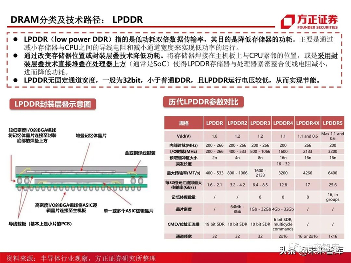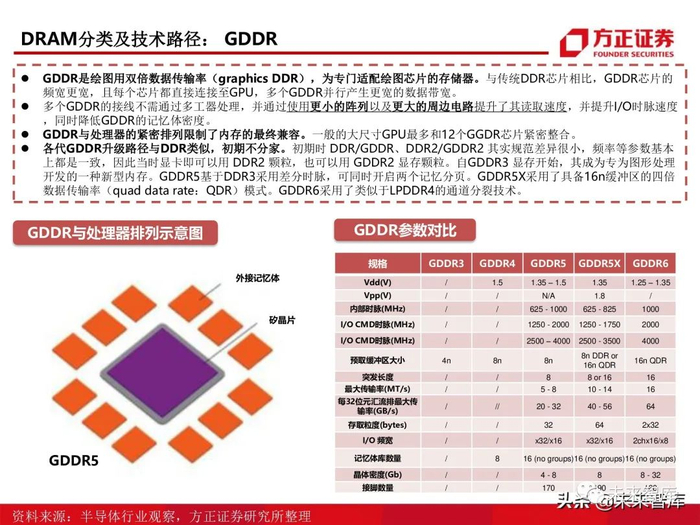 DDR是内存模块中使输出增加一倍的技术,是目前主流的内存技术。LPDDR具有低功耗的特性,主要应用于便携设备。GDDR一般会匹配使用高性能显卡共同使用,适用于具有高带宽图形计算的领域。