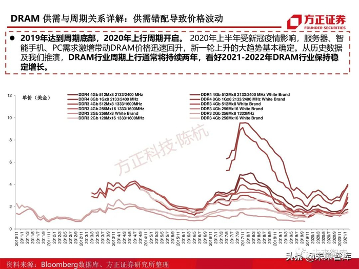 DRAM行业:周期性强,一个周期约为四年。由Bloomberg提供的各型号DDR3/4单价波动来看,2012年至 2016年,2016年至2020年分别为完整的波动周期。DRAM扩产从计划至出货约为两年,故可得一个周期 中价格上行下行分别约两年的原因为:供小于求,价格上行,厂商扩产,供大于求,价格下行。