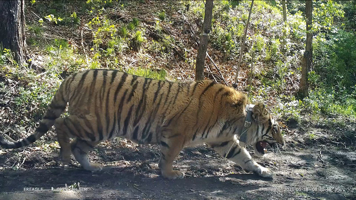 18日放归自然的老虎照片一经发布,它脖子上的项圈就引起了广泛讨论。