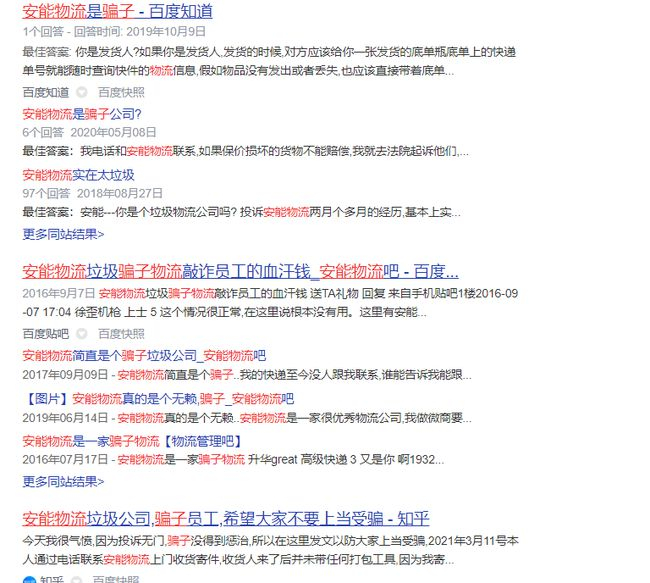 卖家与安能物流沟通仍然无果。随后,李先生在百度搜索关键词“安能物流”时发现,百度上对安能物流的评价非常负面。