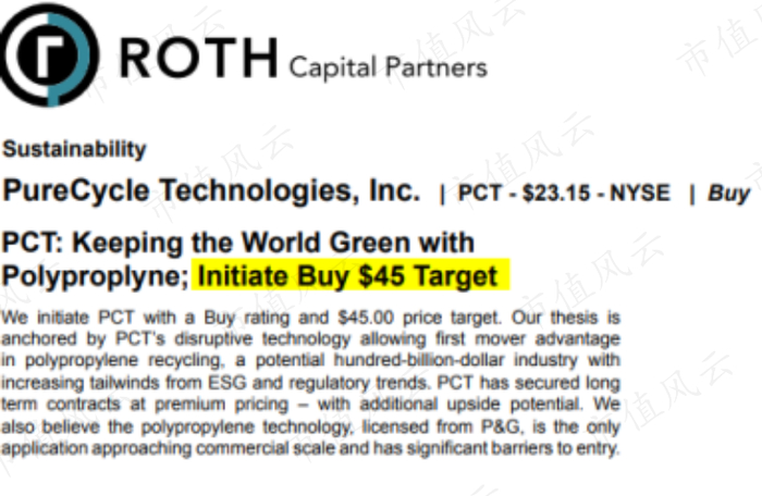 在股票解锁5天后,Roth Capital的研究部门对PureCycle再次给予“买入”评级,设定了45美元的目标价,较该公司前一日收盘价上涨了近94% 。由于这一利好消息,该公司股价当日上涨6.2%。