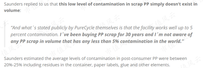 PureCycle宣称,其技术和生产工艺在低于5%的污染水平下,能够实现经济性。