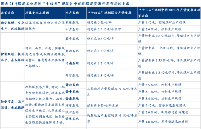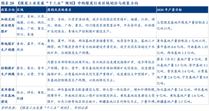 这其中对近几年来我国煤炭行业产生深远影响的重要文件是《煤炭工业发展“十三五”规划》,该文件不仅在总量上提出了煤炭行业化解产能的目标,也提出了“压缩东部、限制中部和东北、优化西部”的全国煤炭生产开发布局政策方向,对我国未来煤炭生产与开发的布局产生了重要影响。