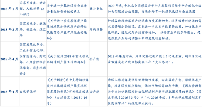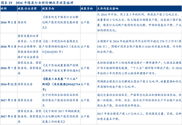 煤炭行业供给侧结构性改革标志性文件是2016年2月份国务院印发的《关于煤炭行业化解过剩产能实现脱困发展的意见》。该文件要求从2016年开始,用3-5年时间退出产能5亿吨、减量重组5亿吨,同时所有煤矿执行276个工作日生产,2016年至今我国出台了多项煤炭行业相关政策并明确了未来煤炭行业长期发展目标,即煤炭的利用方向是绿色开发和清洁利用。