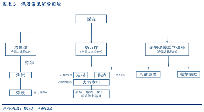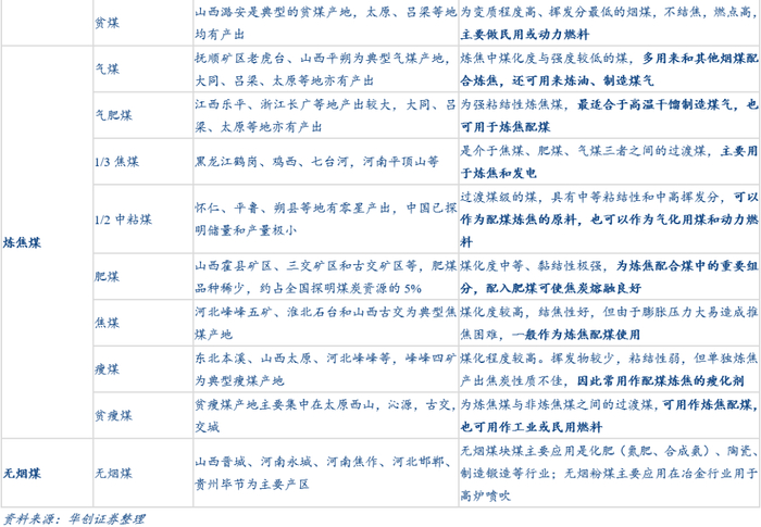 无烟煤:无烟煤为煤化程度最高的煤种,主要对应下游行业为电力、建材和化工。目前无烟煤主要分为块煤、精煤和末煤,其中,块煤的主要下游用途是合成氨,生产尿素等;无烟洗精煤因其热值高、含硫量低等特性被广泛用于高炉喷吹、铁矿烧结、水泥建材等领域。