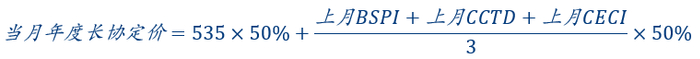 年度长协定价机制:是指供需双方约定的执行期限在一年及以上、有明确数量和价格机制的煤炭购销方式合同双方按年为周期对煤炭进行约定交易的交易模式,定价模式为基准价+浮动价。定价周期为每月一次。但具体的定价公式上需区分下水煤与铁路直达煤。