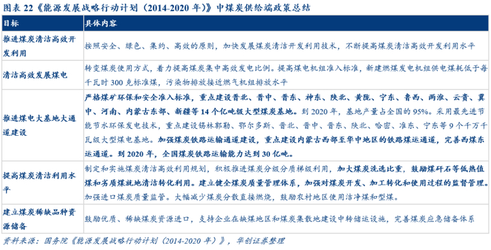 《能源发展战略行动计划(2014-2020年)》:该文件是2014年至2020年这段时期我国能源发展的总体方略和行动纲领,该文件提出坚持“节约、清洁、安全”的战略方针,加快构建清洁、高效、安全、可持续的现代能源体系,提出要增强能源自主保障能力,推进能源消费革命等五大主要任务。综合来看,该文件对煤炭行业的影响主要在于消费端,提出了要降低煤炭消费总量以及煤炭占一次能源消费的比重,但并未明确提出要降低煤炭行业产能,这其实也为2016年我国煤炭行业的供给侧改革埋下了伏笔。在生产端,该文件对煤炭生产行业产生较大影响的主要政策包括“推进煤电大基地大通道建设”和“提高煤炭清洁利用水平”等,具体见下表: