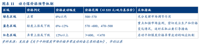 《关于平抑煤炭市场价格异常波动的备忘录的通知》:2016 年 12 月,国家发改委及煤、电、钢行业协会联合发布《关于平抑煤炭市场价格异常波动的备忘录的通知》,明确 2016-2020 年期内,在煤炭综合成本基础上,按照兼顾煤电煤钢双方健康稳定发展的原则,原则上以年度为周期,建立电煤钢煤中长期合作基准价格确定机制,以重点煤电煤钢企业中长期基准合同价为基础,建立价格预警机制:基准价正或负 6%波动幅度以内为绿色区间(正常价格),6%-12%为蓝色区间(轻度上涨或下跌),12%以上为红色区间(异常上涨或下跌);价格位于蓝色区间时加强市场监测,适时采取必要引导措施,价格于红色区间时启动平抑价格异常波动的响应机制。