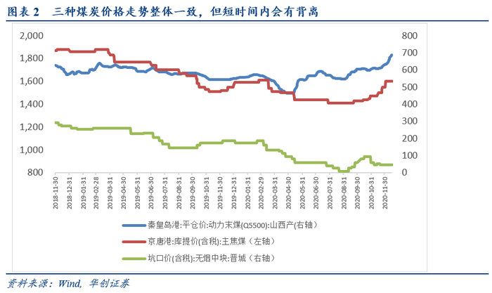 从价格差异上来看,在相同价格口径下目前炼焦煤价格最高,无烟煤次之,动力煤价格最低。由于三种煤炭的终端需求均主要来源于工业与制造业,均顺周期,因此三种煤炭价格走势基本一致,但具体的波动程度有所不同,导致有时会出现背离。