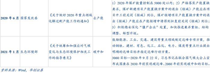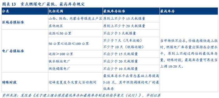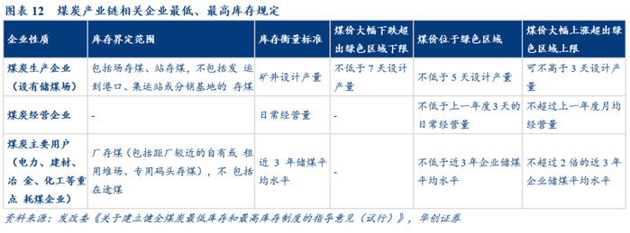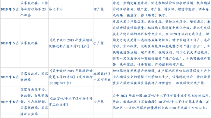 《关于建立健全煤炭最低库存和最高库存制度的指导意见(试行)》、《煤炭最低库存和最高库存制度考核办法(试行)》:两文件于2017 年 12 月由发改委、国家能源局发布,目的在于保障能源供应,同时稳定煤价、减少波动。两文件要求从 2018 年到 2022 年,煤炭产业链的企业按照不同环节、区域、时期等因素维持相应库存,煤炭企业库存需维持 3-7 天的水平,大部分电力企业库存需维持 20天的水平,并明确考核监督机制,对考核不达标的企业,将进行相应的惩罚。