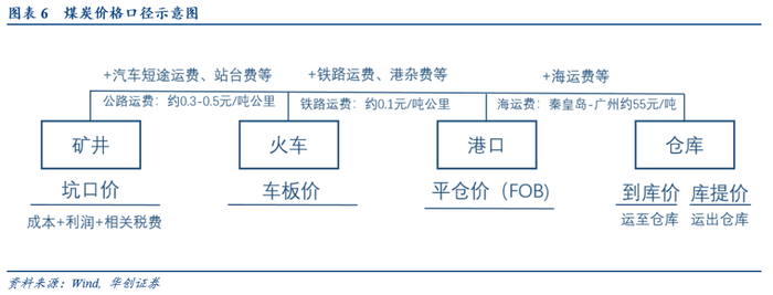 由于我国煤炭具有“资源分布与需求分布空间错位”的特性,即下游需求集中于沿海经济发达城市,而煤炭资源主要分布于内蒙古、陕西、山西等经济较不发达地区,从煤炭出坑到运输至下游发电厂往往长达几千公里,并需要经过公路运输、铁路运输、海路运输等方式,因此运费对下游煤炭用户采购成本会有很大影响,根据煤炭的不同运输状态和销售时交割地点的不同,可将煤炭价格口径分为坑口价、车板价、平仓价等,各自含义如下: