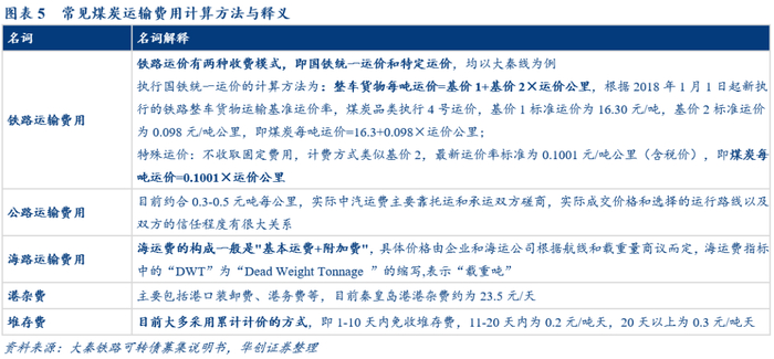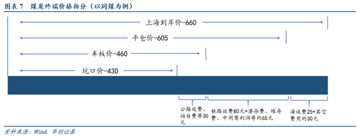目前根据行业经验,煤炭产品本身价格仅占终端价格的60%左右,中间运输环节在终端价格中的权重接近40%。以处于大秦铁路起点的大同动力煤为例进行测算,由于公布数据的频率存在差异,我们选用2020年10月末时的大同动力煤(Q5500)价格,该时段动力煤价格波动较小,周均价与每日价格较为接近,该时段大同动力煤车板价分别约 430 元/吨、460元/吨,大秦铁路煤炭运费约 80元/吨(全程 652 公里、按国铁统一运价测算),秦皇岛港煤炭平仓价约605 元/吨,另外的价差 65 元/吨主要是港口堆存费、港杂费和中间贸易商利润等,上海到岸价与秦皇岛港平仓价差主要包括了海运费(约 25 元/吨)和其他各项费用,整体上,煤炭出坑后各种物流费用合计约 230 元/吨,约占售价的 35%,但由于大同煤矿正好处在大秦铁路的起点,其运费相比其它距离铁路较远和通过其它铁路运输的煤企较低,因此目前大多数煤企的煤炭坑口价仅为终端价格的60%左右。