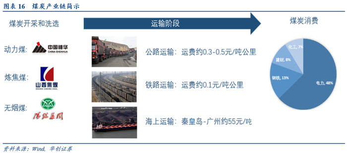 从价格差异上来看,在相同价格口径下目前炼焦煤价格最高,无烟煤次之,动力煤价格最低。动力煤:从广义上讲,产生动力而使用的煤炭都属于动力用煤,动力煤的下游应用主要包括发电(主要是火力发电)、建材、供热等。炼焦煤:顾名思义,炼焦煤主要作为生产原料用来生产焦炭,焦炭多用于炼钢,是目前钢铁等行业的主要生产原料,目前炼焦煤 70%的下游消费为钢铁企业,无烟煤:无烟煤为煤化程度最高的煤种,主要对应下游行业为电力、建材和化工。煤炭产品本身价格仅占终端价格的60%左右,中间运输环节在终端价格中的权重接近40%。