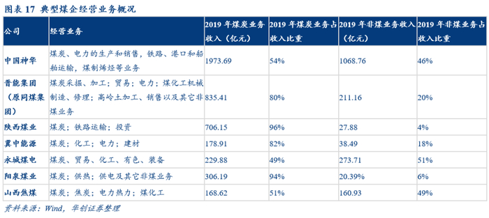目前大多数煤企除了煤炭开采与洗选业务外,多数通过煤炭产业链延申的方式发展了许多非煤业务,虽说是“非煤业务”,但就实际情况来看,煤企的非煤业务必然包括了与煤炭生产高度相关的煤炭产品深加工,即实际上是煤炭产业链的延申,仍然离不开煤。一般来讲,煤炭企业的大多数非煤业务包括煤化工、物流贸易、电力等。综合来看,煤炭开采及业务的毛利率大多分布在20%至60%,且煤炭业务毛利率也大多高于非煤业务毛利率,占收入比重则往往视企业而异,但煤炭毛利润占比绝大部分在 50%以上,是公司经营业务利润的主要来源。