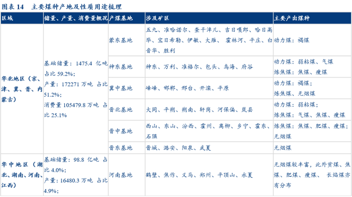 我国煤炭资源丰富但区域分布不均衡是我国煤炭的典型特点,即资源分布与需求分布空间错位。从储量来看,我国煤炭资源分布呈现出典型的“西多东少、北多南少”的特点,储量集中在华北、西北地区的晋陕蒙新四省;从需求来看,煤炭需求集中于华北、东部地区,2018年,我国华北和华东各占煤炭消费量的25%。由于不同地区的地理条件不同,我国各个煤炭生产基地的生产煤种也存在差异。
