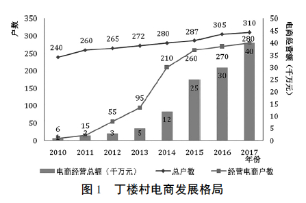 图1呈现了丁楼村电商的发展变化。2010年, 在240户农户中经营电商的只有6户;在被授予淘宝村的2013年, 在272户农户中经营电商的也只有95户;到2014年, 在280户农户中经营电商的农户快速增加至210户, 在2017年310户农户中经营电商的增加至280户。随着电商经营农户数量的增加, 电商经营额也快速增长, 2013年只有5000万元, 到2017年便增加到4亿元。