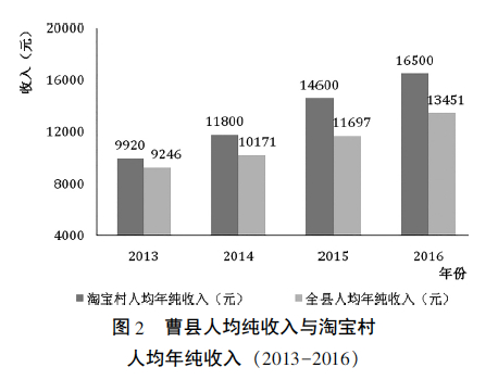 其中, 农民收入的增加是百姓支持政府的基础。以曹县为例, 图2表明, 2013年以来, 淘宝村的人均纯收入始终高于全县的人均纯收入;与此同时, 全县的人均纯收入也在快速增长之中。
