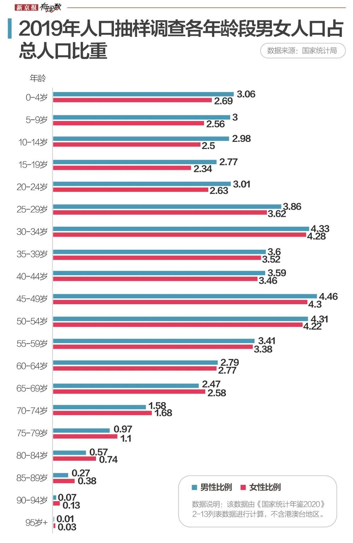 鉴于此次人口普查暂时没有发布具体的各年龄段不同性别的人口比,所以这里采用2019年国家统计局的人口抽样调查数据来分析。