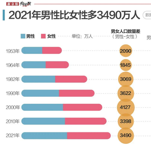 普查数据显示,当前我国男性人口72334万人,占51.24%,女性人口为68844万人,占48.76%,男性比女性多了3490万人,相当于2019年摩洛哥一个国家的人口。