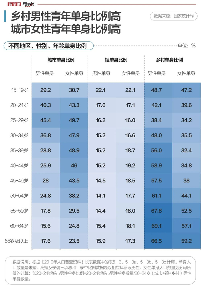 从普查数据来看,20-29岁城镇男性单身比例最高,在30岁及以上男性单身比例中,农村地区是最高的。20—29岁城市单身男青年比例最多、镇次之、乡村最少,30—44岁乡村单身男青年比例最多、城市次之、镇最少。