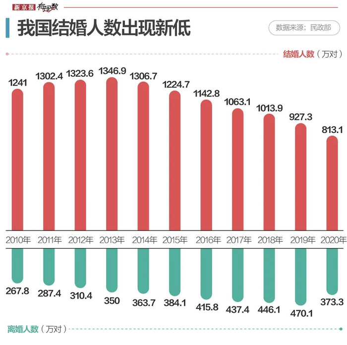 2010年,结婚登记人数为1241万对,2011-2018年均维持在1000万大关,但2019年开始下滑至927.3万,而2020结婚登记人数仅为813万对。