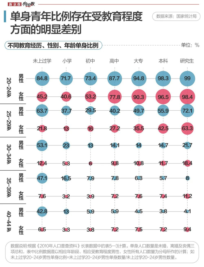 从数据来看,20—29岁受教育程度最高的群体中,不论男女,单身比例都很高。这是因为该数据统计的单身是由未婚、离婚和丧偶三个人群总数相加而来,而这个年龄且在读本科及研究生的人群很少有已结婚或离异、丧偶的,所以单身比例较高,