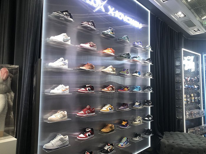 最吸引人注目的是店内的六面鞋墙,上面罗列了NIKE的各种合作款和限量款,以及大火的椰子鞋。