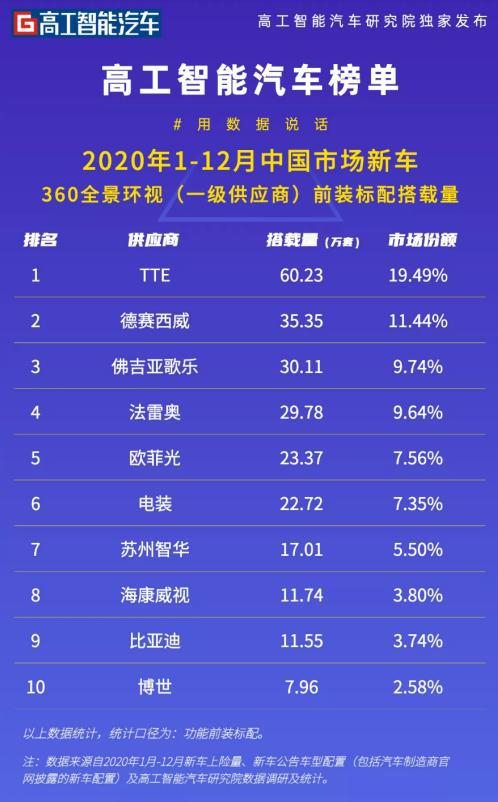 近日,高工智能汽车研究院独家发布高工智能汽车榜单,数据显示2020年全年中国市场新车360全景环视(一级供应商)前装标配搭载量,TTE、德赛西威、歌乐(佛吉亚)、法雷奥、欧菲光(欧菲智联)排名2020年前装标配搭载上险量前五。其中欧菲智联为首次进入前五榜单。