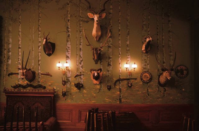 卢茨城堡的战利品室。剧本中描述这是一间“黑暗的、木制装潢的厅堂,到处都挂满了头颅标本(狮子、老虎、水牛、羚羊等)”。