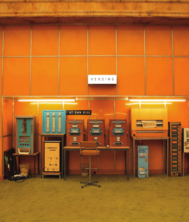 1968 年片段中布达佩斯大饭店大堂的自动贩卖机区域。“故障”和“擅动后果自负”的标识显示了这一时期客户服务质量的退步。