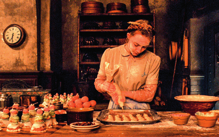 电影《布达佩斯大饭店》中,阿加莎(西尔莎·罗南饰)身着门德尔饼屋制服的剧照。
