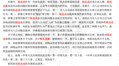 然而其诉讼请求并未得到法院支持,“陈思成(陈思诚原名)作为一名知名演员、知名导演,其具有较高知名度,陈思成应是公众人物,陈思成就其是否出轨问题应接受媒体、公众等合理限度内的评论,乃至批评。”北京市朝阳区人民法院在判决书中表示。