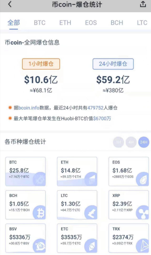 昨晚,全球加密货币遭遇重挫,比特币一度逼近3万美元大关跌30%,以太坊一度跌46%,OKB一度跌56%,莱特币一度跌51%,HT一度跌40%。根据币Coin数据,截至发稿,最近24小时,市场爆仓额约59.2亿美元(约380亿人民币),爆仓人数近48万人。最大单笔爆仓单在Houbi-BTC,价值6700万美元。