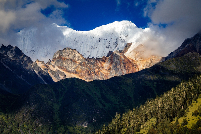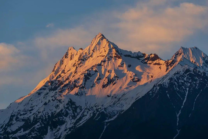 雅鲁藏布大峡谷绕着南迦巴瓦峰转了一个马蹄形的弯,随后通向印度洋的方向延伸出去。在峡谷的北侧,还有加拉白垒峰,海拔7294米,其顶部比较平展,常年被冰雪覆盖,山谷中发育着数十条冰川,其壮丽的景色与南迦巴瓦峰不分上下。