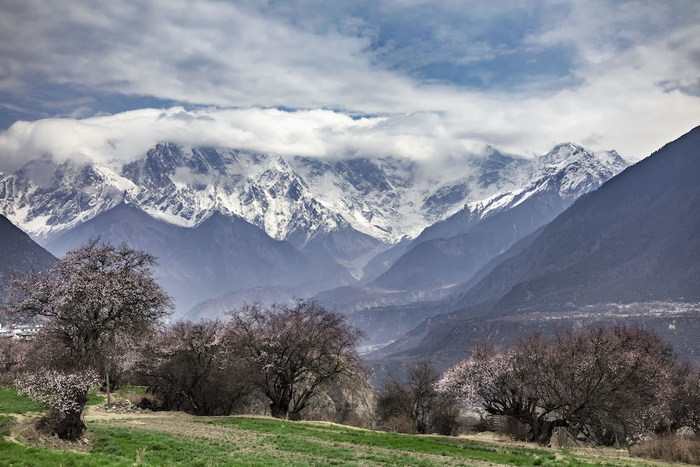西藏林芝市,雅鲁藏布江沿岸盛放的桃花与雪山下的村庄。 视觉中国 图