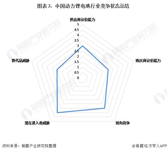 从五力竞争模型角度分析,目前,我国动力锂电池行业替代品威胁较小;现有竞争者数量较多,市场集中度较高;上游供应商议价能力适中,下游购买商议价能力较弱;同时,因动力锂电池行业良好的市场前景以及国家政策的大力扶持,吸引众多企业进入该市场,潜在进入者威胁较大。