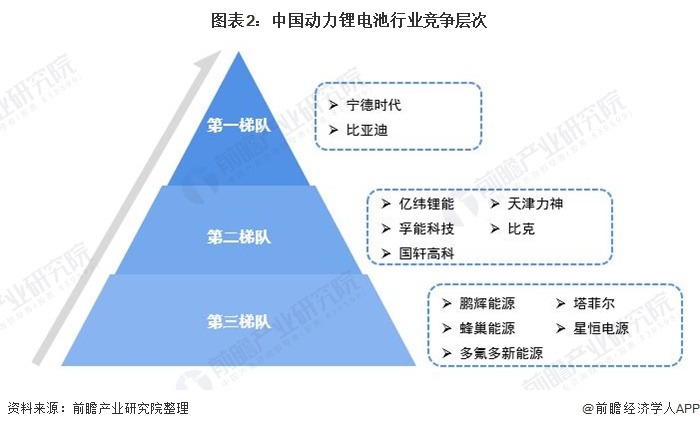 目前,我国国内动力锂电池行业呈现高度集中的贴点,已经形成了三个梯队。第一梯队,包括行业的两大巨头,宁德时代和比亚迪;第二梯队包括亿纬锂能、国轩高科、孚能科技、天津力神和比克电池等;第三梯队包括鹏辉能源、塔菲尔、蜂巢能源、星恒电源、多氟多新能源等。