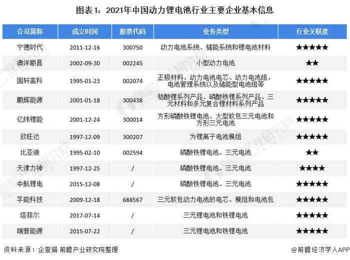目前,我国动力锂电池行业的主要企业包括宁德时代、比亚迪、孚能科技、亿纬锂能、国轩高科、天津力神、中航锂电、北京国能、瑞普能源等。其中宁德时代(300750)、比亚迪(002594)、孚能科技(688567)、亿纬锂能(300014)、国轩高科(002074)为上市公司。