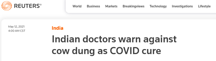 据路透社报道,印度的医生们多次警告称,使用牛粪抵御新冠肺炎病毒没有科学依据证明其有效性,而且有传播其他疾病的风险。