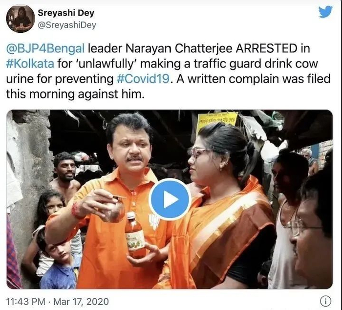 去年,当全球疫情还在初始阶段时,印度人民党孟加拉主席就表示,“我对承认自己饮用牛尿没有任何不安。”当时他在加尔各答的一个活动上怂恿民众喝牛尿来预防新冠病毒。