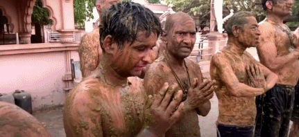 视频显示,这群坚信涂抹牛粪可以治疗新冠肺炎的男子,赤裸着上身,蹲坐在地上,将牛粪涂抹全身,然后双手合十,口中念念有词。