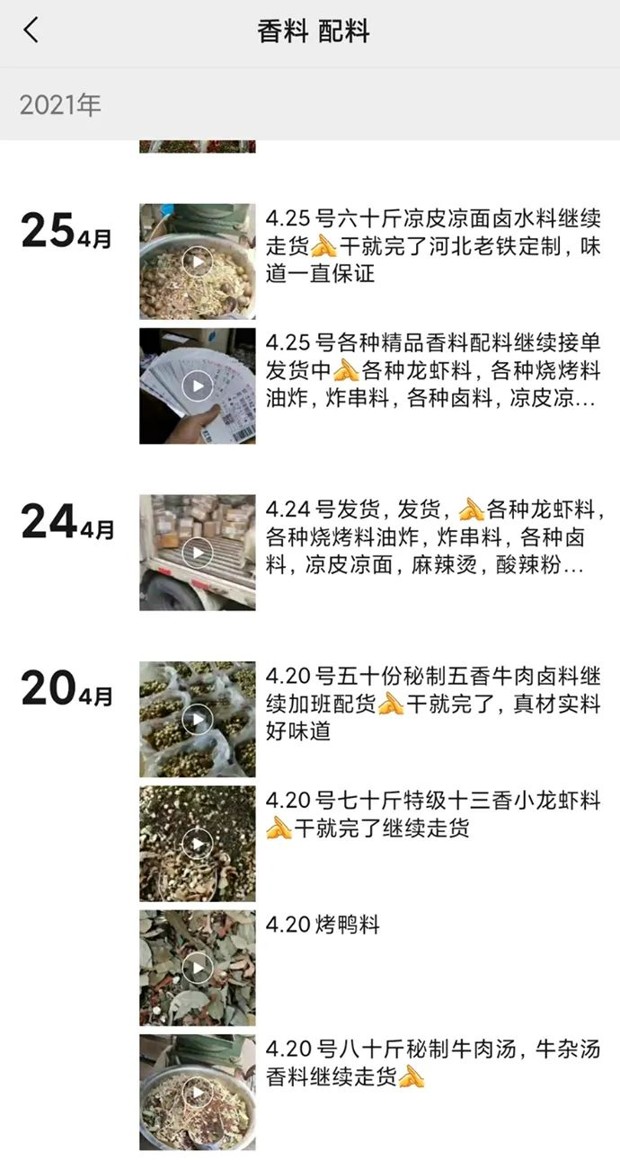 4月29日下午,记者添加了一个微信昵称为“香料配料”QQ群管理员,其朋友圈中每天会发布数条搭配研磨香料的短视频,配文称是为帮客户配秘制精品香料,包括龙虾料、卤料、凉皮凉面料、烧烤料、炸串料、羊肉汤料、麻辣烫料等。